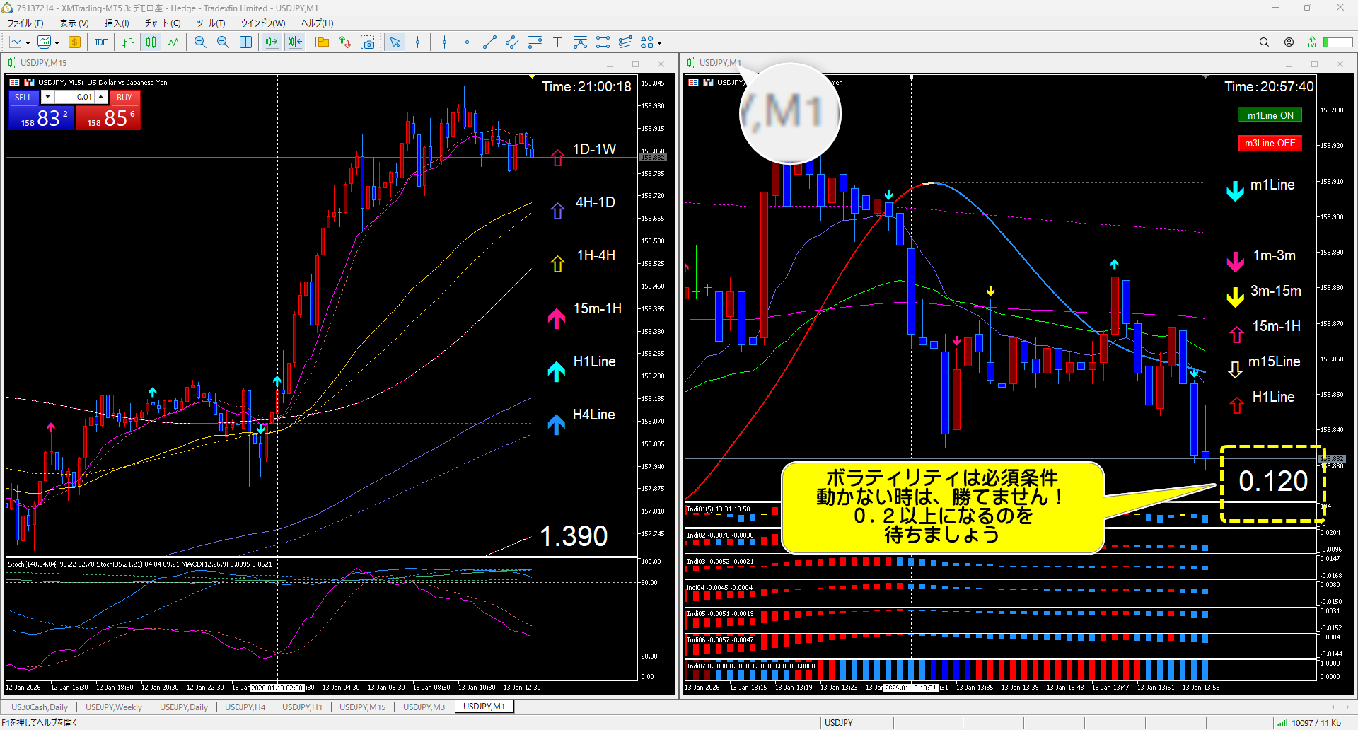 ボラティリティが無い時は様子見です。 Scalper-FX 2026.01.13 Scalper-FX どの時間軸においても同じことが言えます。ボラティリティが無い時はスキャルはできません。と、言うか・・・負ける確率が非常に高くなります。せめてボラティリティが「0.2」を越えてくるまでは様子見です。逆に「0.3」以上ある時は、積極的に攻めましょう。この見極めが大事。
