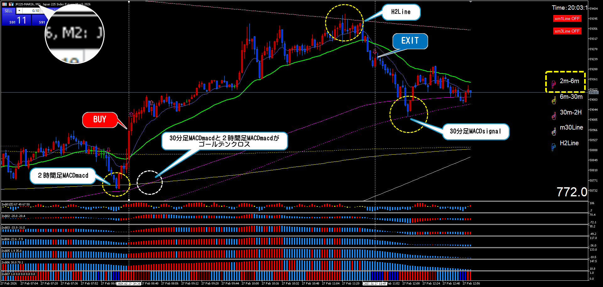 日経225先物 2分足チャート Scalper-FX 2026.02.27 日経225先物 2分足チャート 今日は、終始、2分足チャートが機能していました。 午後の上昇を止めたのはH2Line Scalper組は、6m-30mだけで勝てたことが分かるはずです。 ナイトも引き続き2分足チャートは要チェックです。 ご参考に!!!(^_-)-☆