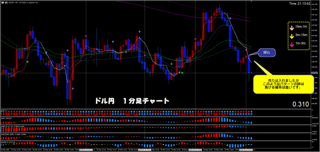 とりあえず、サイン通りに売りを入れましたが、このようなパターンの時は、勝率は落ちます。