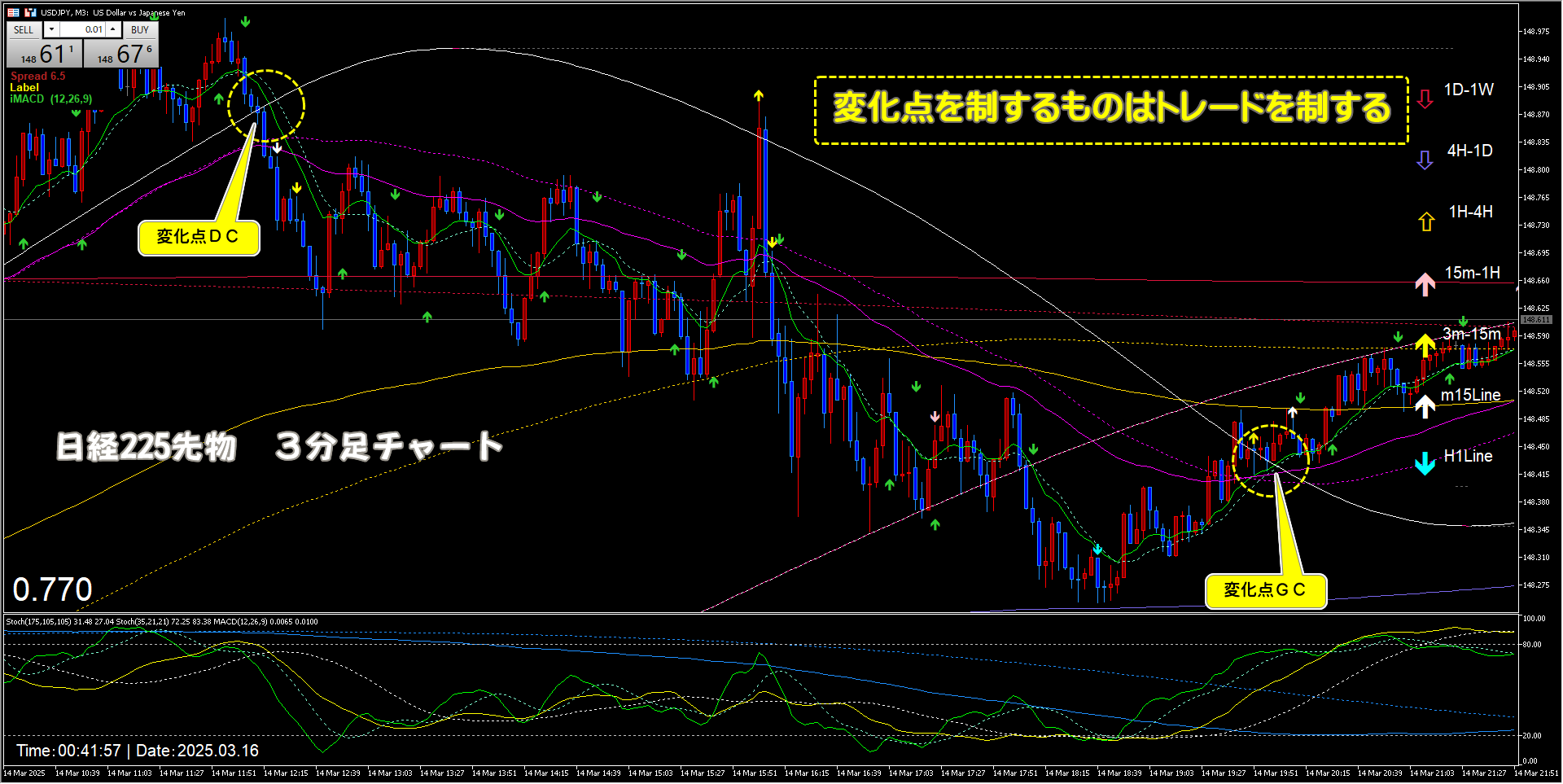 Q.勝てるパターンを教えてください。 Scalper-FX 2025.03.16 Q.勝てるパターンを教えてください。 A.周期変化点を制すること! よく頂くご質問です。そして、真っ先にお返しする答えがこれです。チャートは、3分足で例にしていますが、この捉え方は日足チャートでも同じです。 変化点を制するものはトレードを制する!