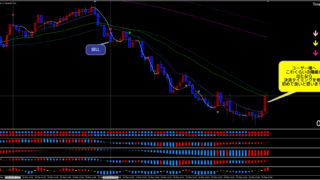 上の画像は、現在、動いている値幅が、「0.3」以下であれば、他の2つのサインが売りサインを出していてもエントリーしない方が良いパターンの典型例です。