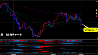 ドル円 1分足チャートルール通りに決済しましょう。再度、下向きになってくる可能性はありますが・・・デイトレは、デイトレ!ルールを守って、淡々と・・・