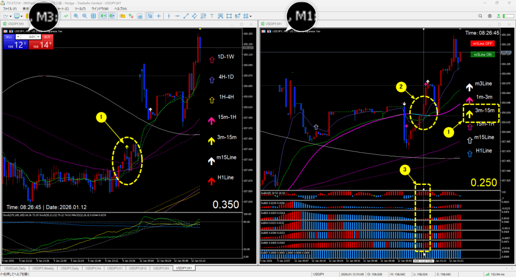 - 3m-15mの方向を確認(1分足スキャルでは、この方向を基準とします。)