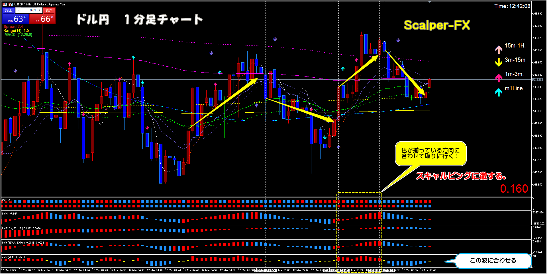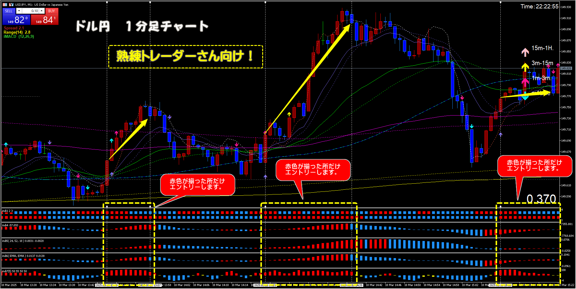 スキャルピング Entry Point X Facebook はてブ LINE コピー 2025.03.172025.03.18 ドル円 1分足チャート これは、上級者向けのテクニックです。自称:初心者の方は、止めておきましょう。 indi7を基本に据えて、同じ色が揃ったならエントリーします。赤なら買い。青なら売り。本当のスキャルピングです。ご参考に!!!(^_-)-☆ 追記 ドル円 1分足チャート 大きな流れは、上方向なので、上昇の赤色が揃ったところだけエントリーします。 熟練トレーダーさん向けではありますが、波がレンジだと分かる方は、エントリーしても良いと思います。 ご参考に!!!