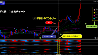 ドル円 1分足チャートレンジ抜けのエントリー(初心者さんはできなくてもOK!そのうち、出来るようになりますから。)1.レンジ抜けを確認。2.indiの色が全部揃っている。3.矢印の方向が揃うであろう予想ができる。この流れでエントリーです。あ...