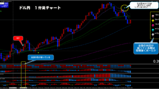 ドル円 1分足チャート今回のエントリーは、それほど下がらないことを考慮して慎重に対処しましょう。利益確定が優先で・・・損をしたくないので、必ず、カットを入れています。