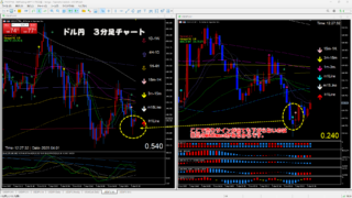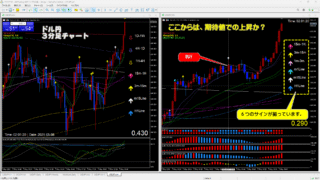 今現在の状況説明です。3分足のMACDが売りサインを点灯していますが、これでEXITはしません。右側の矢印群が全部上方向に揃っている間は、我慢強くホールドです。