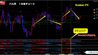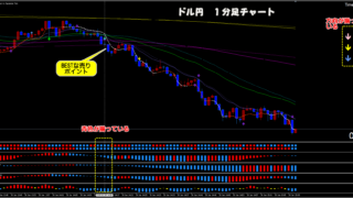 ドル円 1分足チャートこれは、上級者向けのテクニックです。自称:初心者の方は、止めておきましょう。indi7を基本に据えて、同じ色が揃ったならエントリーします。赤なら買い。青なら売り。本当のスキャルピングです。ご参考に!!!(^_-)-☆追...
