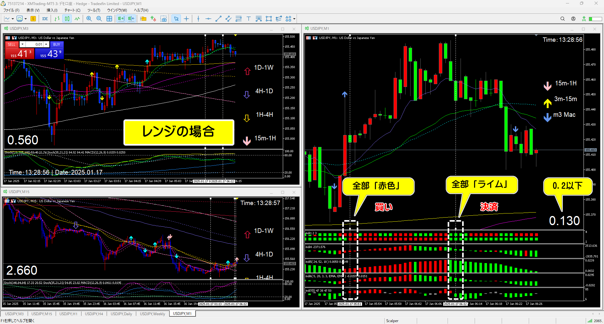インジケータの色が全部「赤色」になった時が買いのサインです。