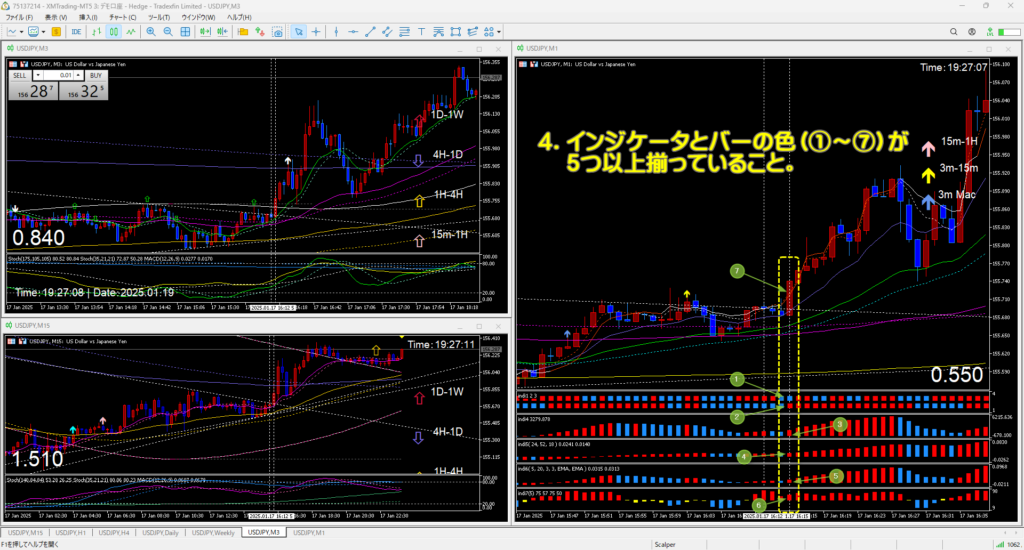 4.インジケータとバー(①~⑦)の色が、5つ以上揃っていることを確認。
