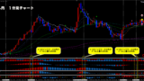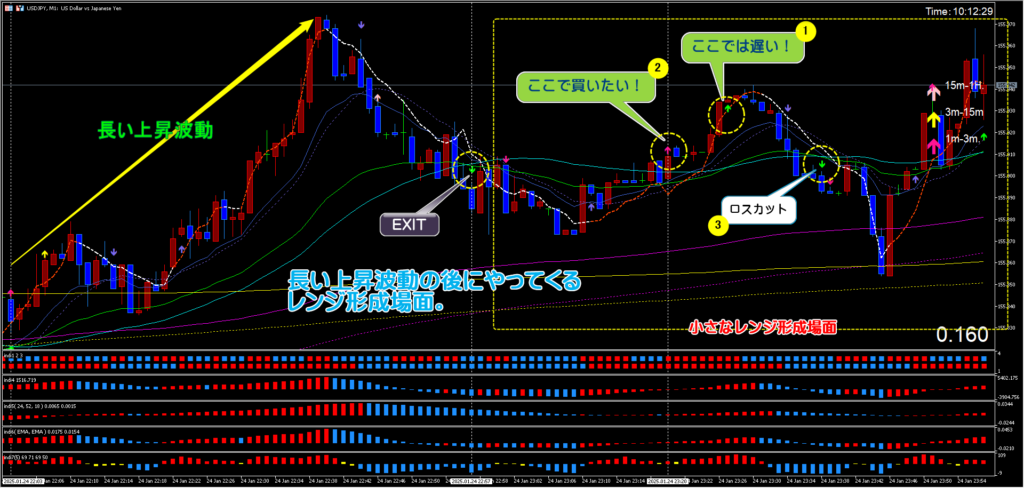 2-2.大きな上昇波動の後にやってきた小さなレンジ場面でのエントリー。 Trade-rule 2025.01.26 大きな上昇波動の後にやってきた小さなレンジ場面では、3分足のMACDの変化(1)を待っていては、エントリータイミングとして遅い場面があります。 よって、このような場合には、(2)の1m-3mのクロスを狙います。 このように判断をすることで、(3)のロスカットに対しても損失を少なくすることができます。